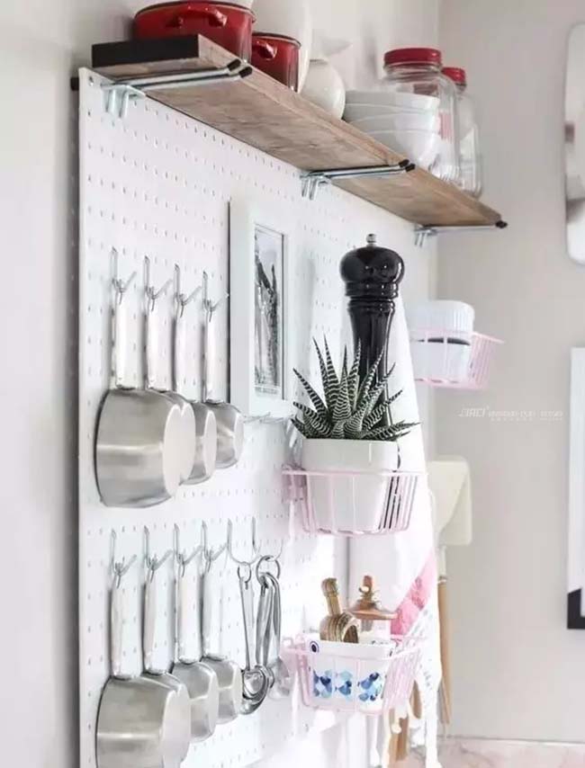 在墙上安装一个洞洞板,安上横板和挂钩,就可以收纳许多东西了。