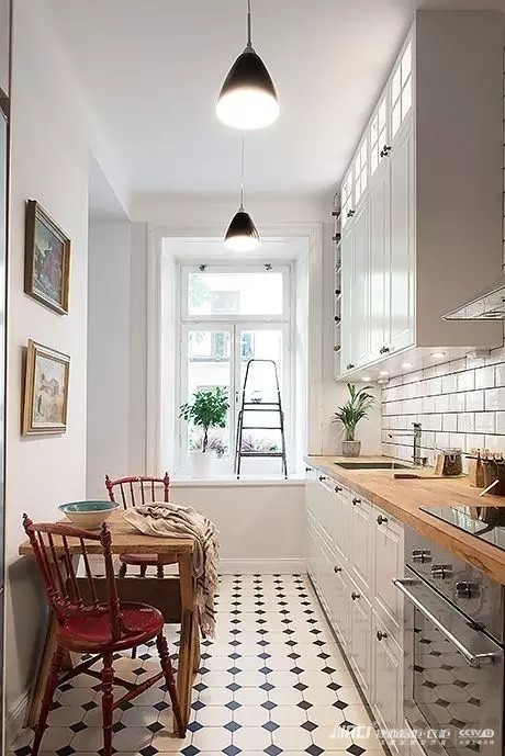 厨房灯光需分成两个层次:一个是对整个厨房的照明;另一个则是对洗涤、准备、操作各区分别的局部照明。后者中洗涤与准备区,一般可以在吊柜下部布置射灯光源,并设置方便的开关装置。而在操作区中,充足的光线能使您在操作时更能掌握火候。
