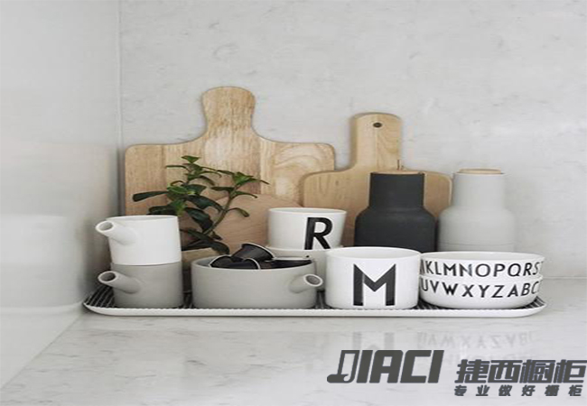 台面上的拐角不利于用就会变成卫生死角,用尺寸刚好的收纳盘摆放其中,把那些你最喜欢的厨房用品放在其中。裸露在外的物品最好精致,并有独立的格调,形成一景。