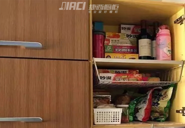 目前主流橱柜的搁板柜只有一个搁板,将橱柜分割成两个40㎝左右的高度。这样的高度放置厨房小家电比如豆浆机、煮蛋机等刚好合适,如果放置碗等比较矮的物品,空间浪费严重。搁板下挂篮能帮助我们充分利用空间。