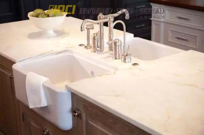 如图中展现的台面,与铜黄色吊灯相互映衬,柔软的斑点和颗粒花纹不会显得过于严谨,相反让人感觉十分舒适。